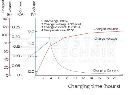 - Рекомендуемое напряжение заряда в циклическом режиме для 12В батареи: 14,5В-15,0В при 25ºС;