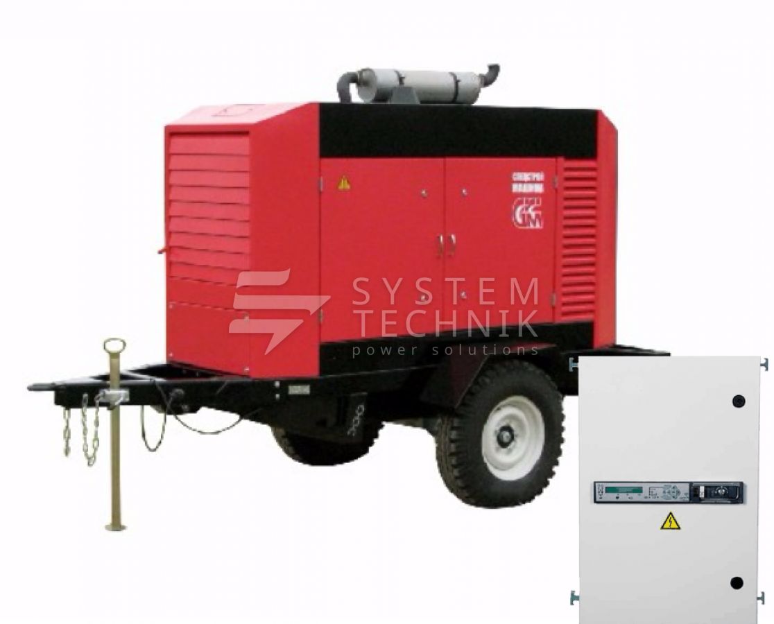 - ССМ ЭД-50-Т400-2РПМ1 в погодозащитном кожухе на шасси с АВР на прицепе