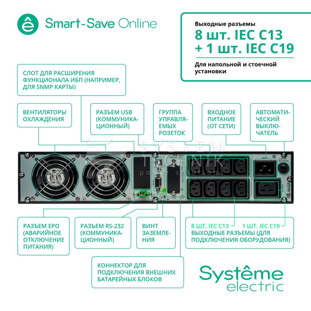 | Выходные разъемы | 8 IEC 60320 C13 + 1 IEC 60320 C19 |
